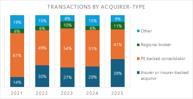 Private-equity-backed national consolidators continue to account for the largest share of transactions, in part because there are simply more of them, and acquisitions remain central to their growth. Just as importantly, these consolidators, both private-equity and insurance company-backed, have been the buyers willing to pay the highest prices, and they have largely been responsible for driving valuation levels across the industry.