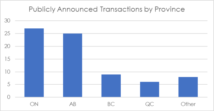 Publicly announced transactions continue to be concentrated in Ontario and Alberta. This largely reflects where national consolidators have focused their acquisition efforts, rather than a lack of activity in other provinces.
