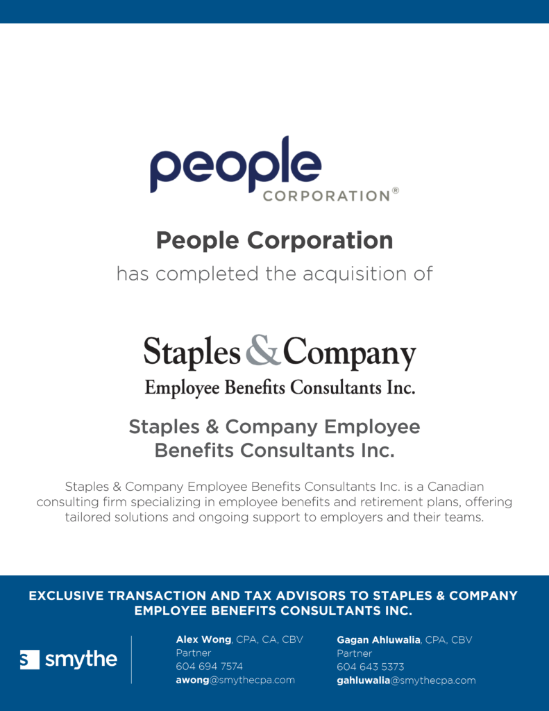 Acting as the exclusive transaction and tax advisors to Staples & Company Employee Benefits Consultants Inc., the Smythe Advisory team is pleased to announce the sale to People Corporation.